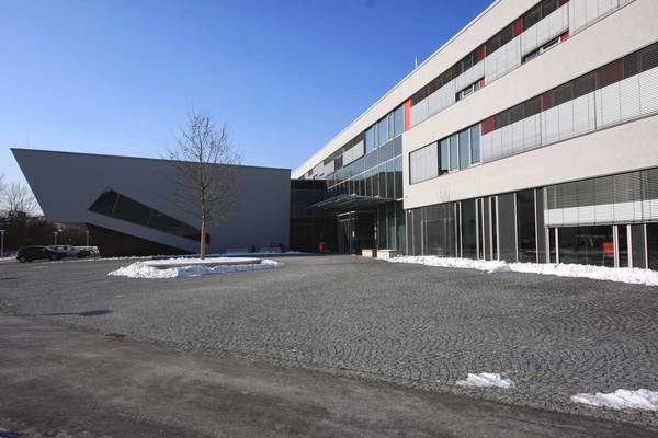 Das konstruktive Gebäudekonzept basiert auf einem Stahlbeton- Skelettbau in einem Achsraster von 7,50 Metern. Geschickt angeordnete Aussteifungsscheiben und schlanke, runde Tragstützen scheinen die Gebäudestruktur weitgehend aufzulösen. Sie unterstützen die Transparenz und verschaffen dem Erdgeschoss in Verbindung mit der großzügigen, Gebäude umgreifenden Aufglasung einen nahezu „schwebenden“ Charakter. Scheinbar gegensätzlich zu dieser formellen Klarheit und Leichtigkeit des Hauptbaukörpers steht der weitgehend geschlossen wirkende Hörsaaltrakt.