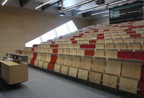 Treppengeländer als schlanke Senkrecht-Stabgeländer mit grauer Eisenglimmerbeschichtung. Eingenutete Holzhandläufe aus Ahorn runden das klare und zurückhaltende Farbspektrum ab. Materialität und Farbigkeit wurde konsequent auf die Ausstattung der Hörsäle übertragen und bei der Hörsaalbestuhlung durch farbige Einstreuung von Rottönen erfrischend ergänzt. Die exakte Ausführung sämtlicher Raumoberflächen, insbesondere der Wand- und Deckenverkleidungen mit Ahorn Akustik-Paneelelementen, lässt die intensive Detailplanung erahnen, die mit hoher Genauigkeit umgesetzt wurde und somit den Hörsälen einen Hauch von Exklusivität vermitteln.