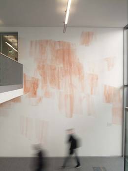 Nicht unerwähnt bleiben darf die künstlerische Ausgestaltung des Gebäudes. Im Rahmen eines beschränkten Wettbewerbes unter elf Teilnehmern konnte Thomas Bechinger die Jury mit seinem Konzept zur farbigen Bemalung einer zwei Geschoss hohen Wandfläche in der unmittelbaren Eingangszone beeindrucken. Dabei erstreckt sich die „Wandmalerei“ mit hochlichtechten Pigmenten weit in die Gebäudetiefe bis in den künftigen Cafeteriabereich, ist ebenfalls in Anlehnung an das angrenzende Bestandsgebäude farbig in ziegelrot gehalten und mit unterschiedlicher Intensität aufgetragen.