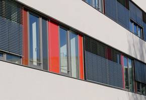 Bei der Farbgestaltung der Außenhaut fand der Architekt durch Wahl eines dezent hellgrau getönten und mit Spachtelstruktur aufgetragenen Putzes für die Wand- flächen geschickt den Übergang zwischen eingangs erwähnter Farbgebung des Ursprungscampus und der Neubebauung im äußeren Campusring; in unterschiedlichen Rottönen gehaltene Glaspaneelelemente, die nur scheinbar willkürlich in den Fensterbändern der Obergeschosse angeordnet sind, spiegelt sich dabei die Farbvariation des Altgebäude-Sichtziegelmauerwerks wider.