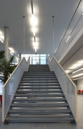 Großzügig breite Treppen in schlanker Stahlkonstruktion erschließen die Ebenen untereinander. Für die barrierefreie Verbindung der Geschosse sorgt ein freistehender Aufzug mit verglasten Umfassungsflächen. Deckenöffnungen zwischen den Ebenen begünstigen die Transparenz des Gebäudes, die durch geschickte Tageslichtführung mittels Dachoberlichtbänder und geschossübergreifender Aufglasung der Foyerfassade unterstützt wird. Generell sorgen die Lichtführungen der Flurzonen im Gebäudeinneren für hohe Raumqualitäten mit vielfältigen Erlebnis- und Nutzungsangeboten; vom Foyer aus ist der Blick bis über Dach möglich.
