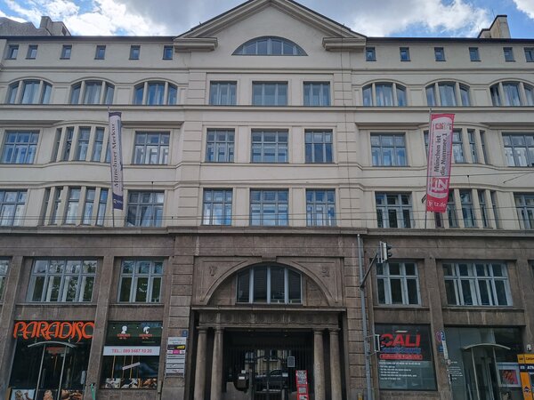 Baukünstlerisch herausgehoben ist insbesondere das vierte Obergeschoss unter der Attikazone durch eine Reihe vor den Pfeilern stehender, monumentaler Figuren. Durch die aus der Achse verschobene breite Tordurchfahrt gelangt man in einen Innenhof mit rückwärtigem Zugang zum Dülfergebäude an der Bayerstraße 57/59, einst Aushängeschild des Jugendstils in der Münchner Architekturlandschaft.