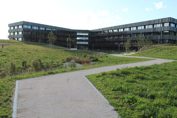Bei den Außenanlagen steht dabei das Zusammenspiel von neu geschaffenen öffentlichen Räumen und den bestehenden Grünstrukturen im Mittelpunkt. Ehemalige Acker- und Grünlandflächen wurden behutsam in das Gestaltungskonzept eingebunden. So entsteht ein natürlicher Übergang zur offenen Landschaft, der das Gebäude mit seinem Umfeld verzahnt.