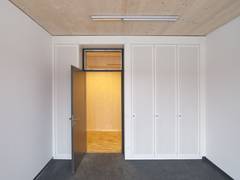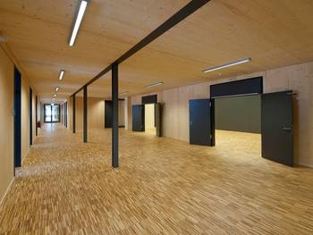 Die in einem warmen Rotton gehaltene Fassadenfarbe ist an die Farbgebung historischer Holzfachwerkhäuser der Region angelehnt. Bei der Wahl der Materialität und Farbgestaltung wurde insgesamt auf die Reduktion gesetzt: Böden im Hauptzugangs- beziehungsweise Sauberlaufbereich in Naturstein, Treppenläufe in Stahl mit Natursteinauflage, Nottreppen in Beton mit Kunststein, sämtliche Flure sowie Sitzungs- und Speisesaal in geöltem Industrieparkett, die Büros mit anthrazithfarbenem Linoleum und die Sanitärbereiche schlicht weiß und grau mit Fugenschnitt gefliest. Schließlich die Wände in den Büros weiß, holzsichtige, konstruktive Brettstapeldecken und Flurwände wiederum in Nadelholz.