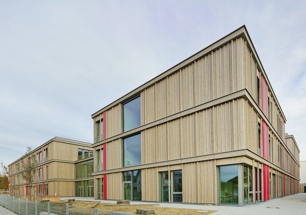 Ziel der Planung war es, Synergien mit der parallel laufenden Sanierung und Erweiterung der Grundschule zu nutzen. Eine gemeinsame Adressbildung mit klarem Haupteingang stärkt den Campusgedanken und verbessert die Erschließung. Der Eingangsbereich an der Ingolstädter Straße entlastet zudem den angrenzenden Stadtweg.