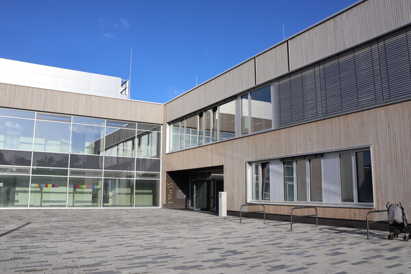 Das Ensemble überzeugt mit seiner städtebaulichen Anordnung und macht in einem kompakten Bauvolumen die unterschiedlichen Nutzungen am Bildungsstandort aus Schule, Kindertagesstätte und Sporthalle ablesbar. Über einen gefassten Vorplatz erreicht man vom öffentlichen Straßenraum die Eingänge zur Schule und zur Kindertagesstätte. Die Schule empfängt ihre Besucher in einem offenen Foyer, das gleichzeitig die Möglichkeit des Aufenthalts bietet und die zentrale Verteilfunktion der Erschließung übernimmt.