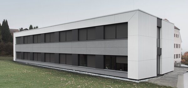 Der barrierefreie Erweiterungsbau für die Außenstelle ist ein Massivbau aus Stahlbeton mit einem Flachdach, das über die gesamte Länge mit Photovoltaik belegt ist. Als Bekleidung für die vorgehängte Fassade wurden Faserzementplatten gewählt, die sich auch unter rauen klimatischen Bedingungen durch Wartungsarmut und besondere Langlebigkeit auszeichnen und somit die Lebenszykluskosten des Gebäudes geringhalten.