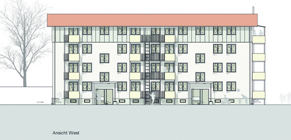 Äußerlich erhielt das Gebäude einen sandfarbenen Anstrich wobei sich die Aufstockung und der Sockel farblich absetzen. Die Außenanlagen erhielten ebenfalls eine Rundumerneuerung und richten sich nach der neuen Bewohnerstruktur. Kleine Kinder freuen sich über ein Spielschiff zum Klettern und Turnen, Jugendliche können sich auf der Spielwiese zum gemeinsamen Ballspielen treffen. Eine große Sitzbank im Grünen bietet Erholung und Gelegenheit zum Kennenlernen für Mieterinnen und Mieter jeden Alters.
