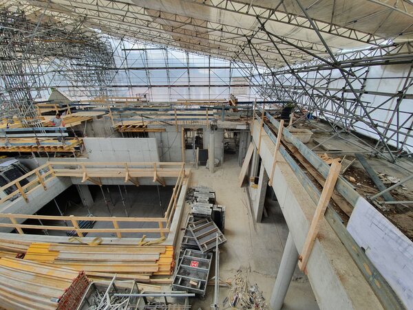 Zur Sicherstellung des Bauablaufs wurde über dem gesamten Gebäude ein großflächiges Wetterschutzdach aus Gerüstträgern errichtet. Die aus dem Wetterschutzdach resultierenden Zusatzlasten erforderten ein abgestimmtes Abstütz- und Lastverteilungskonzept, über das die Einwirkungen kontrolliert in mehrere tragfähige Bestandsachsen eingeleitet wurden. Die Unterstützungskonzepte wurden in Abhängigkeit vom Baufortschritt fortlaufend angepasst und auf die jeweils neu entstehenden Bauzustände abgestimmt.