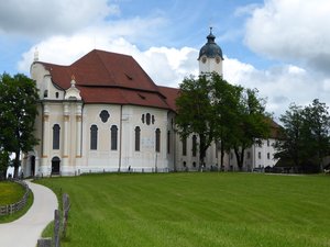 (Der Biergarten des Landhotels Gockelwirt - Foto: Hotel; mit dem Rad unterwegs im Schlosspark - Foto: Michael Schinharl; zwei Sehenswürdigkeiten im Schlosspark - die Wieskirche und Schloss Neuschwanstein - Fotos: Friedrich H. Hettler)