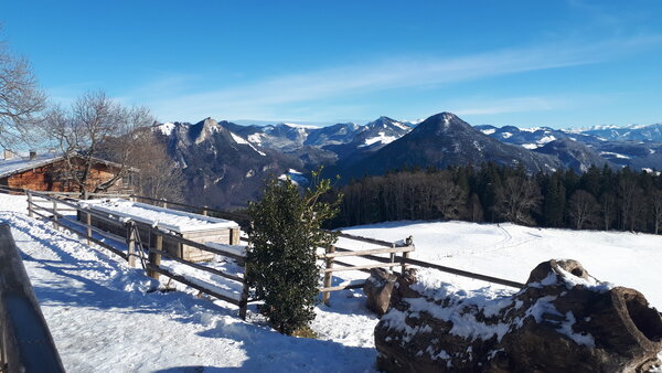 Geöffnet ist beispielsweise die Dandlbergalm, die auch für Familien mit Kindern leicht zu erreichen ist. Unterwegs kann man hier den Ausblick auf Nußdorf a.Inn und den Wendelstein genießen. Von Bad Feilnbach aus bietet sich eine Wanderung zur Tregler Alm an. Wer gerne rodelt, steigt von Aschau i.Ch. zur Maisalm auf und fährt bei entsprechender Schneelage mit dem Schlitten den Berg herunter. Eine etwas längere Tour führt von Flintsbach a.Inn über den Petersberg mit der Wallfahrtskirche St. Peter auf die Hohe Asten. Auf diesem Weg lassen sich im Winter oft Eiswasserfälle bewundern und am Ende wartet ein einzigartiges Alpenpanorama. Bitte beachten: Bei Schnee und Eis sind für Wanderungen in den Bergen Grödel oder Spikes empfehlenswert.