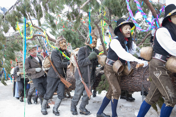 60 Männer in historischen Kostümen und mit traditionellen Holzmasken ziehen einen 30 Meter langen Zirbenstamm auf einem Holzschlitten durch das Dorf. (Foto: Andreas Kirschner)