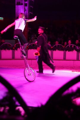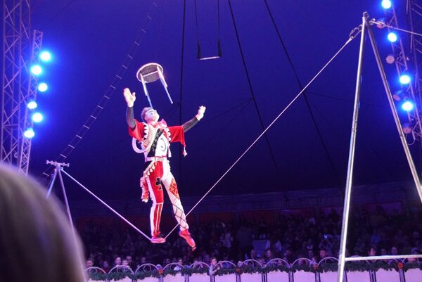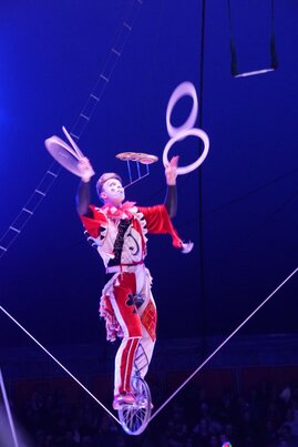 Ein Highlight der Vorstellung ist sicherlich der ukrainische Schlappseil-Artist Hidei Mykhailo. Wenn er auf dem Einrad stehend Teller und Reifen jongliert, tobt die Menge.