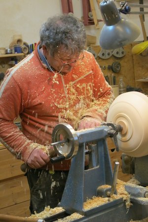 Handgriffen aus einem plumpen Holzstock eine Schale. Aus Wurzelholz fräst er niedliche, kleine Holzknöpfe oder gestaltet – wie sollte es auch anders sein – einen überdimensionalen Apfel. Und wenn auch die Holzspäne wie Funken um seinen Kopf wirbeln, der Kunstdrechsler Windegger lässt sich nicht beirren. Denn zum Schluss ist es noch immer gutgegangen und das neu gedrechselte Stück findet Bewunderung und wird im Atelier verkauft.