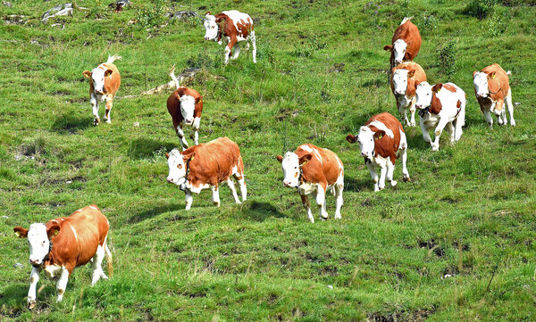 Postkarten-Oberbayern: Jungrinder toben ausgelassen auf einer Bergweide bei Mittenwald. (Foto: Bitala)