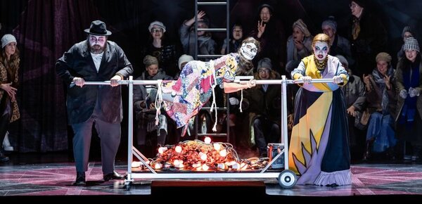Ein entfesseltes Höllenspiel an Heiligabend: Wenn die Hexe Solocha von Ekaterina Semenchuk ihr Unwesen treibt und die Dorfbewohner vom Teufel besessen sind, werden bald Menschen aufgespießt und gegrillt. Auch sie selbst dreht lustvoll am Spieß (links). (Foto: Bayerische Staatsoper/Geoffrey Schied)