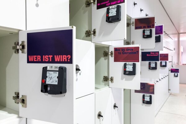 Also Fragen stellen und nicht Antworten geben: Darauf setzt auch Elsa Oberndörffer, wenn sie an die Türen der Garderobenspinde für Besucherinnen und Besucher selbst formulierte Fragen klebt. Etwa: „Sind wir kritikfähig?“ oder „Wer ist wir?“ – das alles auf Deutsch und auf Englisch.