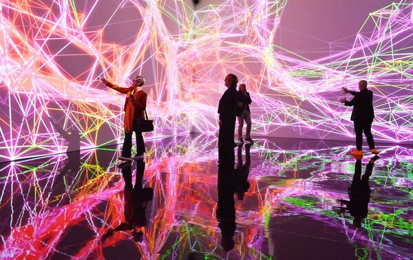 Denn spacig genug ist es ja, was einen da an optischen Sensationen umkreist wie im Sternenkarussell, im Hyper-Cyber-Giga-Planetarium. Ringe und Blasen, Schlieren, Fraktale und vegetabile Gestalten in ständig wechselnden Farben und Formen ziehen als gigantische Videoprojektion über die Wände, teils verdoppelt von Spiegeln, und die Besucher wirken am Kunstwerk mit: Sie verändern durch ihre Bewegungen diesen betörenden, während der Ausstellungsdauer sich ständig selbst weiterentwickelnden Fluss der Ornamente, den eindringlich-dezente Sphärenklänge begleiten.
