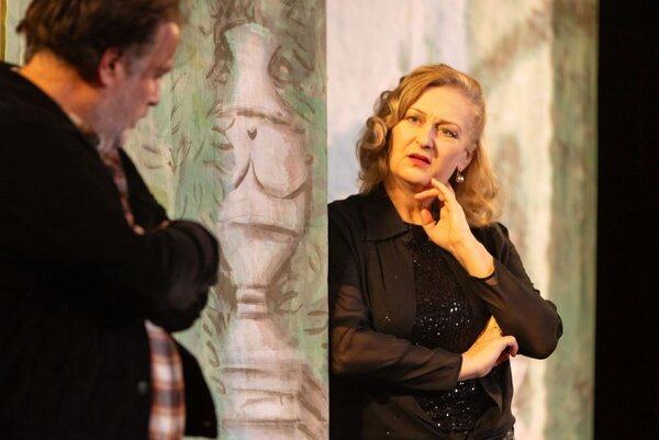 Theo (Thomas Weber) und Anke (Margret Gilgenreiner) diskutieren und streiten miteinander. (Foto: Landestheater Dinkelsbühl, Pedro Malinowski)