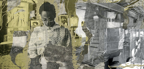 Für "Samit My Father, in the Old Studio" (2022, Ausschnitt) kombinierte Alice Rekab ein Familienfoto mit historischen Aufnahmen der Villa Stuck und überzeichnete die Collage digital. (Foto: Alice Rekab)