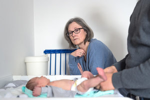 Foto (Sina Schuldt/dpa): Hebamme Sabine Pischinger beobachtet einen Vater, der seinen Sohn wickelt.