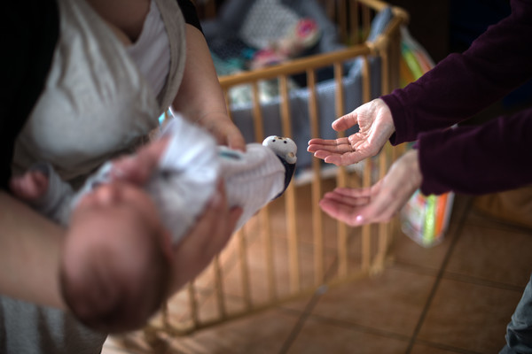 Hebamme Sabine Pischinger lässt sich von der Mutter ein wenige Tage altes Kind überreichen. Mehr als 200 Kindern hat sie schon auf die Welt geholfen. (Foto: Sina Schuldt/dpa)