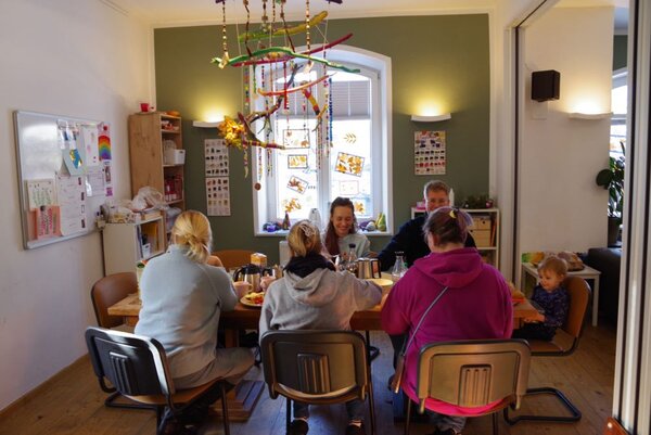 Ein Villenviertel in München Pasing. Das alte Haus aus der Gründerzeit liegt inmitten eines größeren Gartens. Im Erdgeschoß sitzen in einem der Räume mehrere Frauen an einem gedeckten Tisch mit Kaffee und Brötchen, ein kleines Mädchen im blauen Kleid tollt herum. An der Wand hängen selbstgemalte Aquarelle, in einer Ecke liegen auf einem anderen Tisch die Zutaten, aus denen man Weihnachtskränze bastelt: getrocknete Zimtsterne, Tannenzweige etwa. Es ist Freitagvormittag und auf dem Wochenplan der „LebensRäume“, einer Institution der Diakonie, steht „Elternbrunch“.