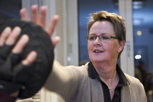 Foto (dpa): Auch Alexandra nimmt an dem Selbstbehauptungskurs teil. Sie übt den Schlag ins Gesicht eines Angreifers.