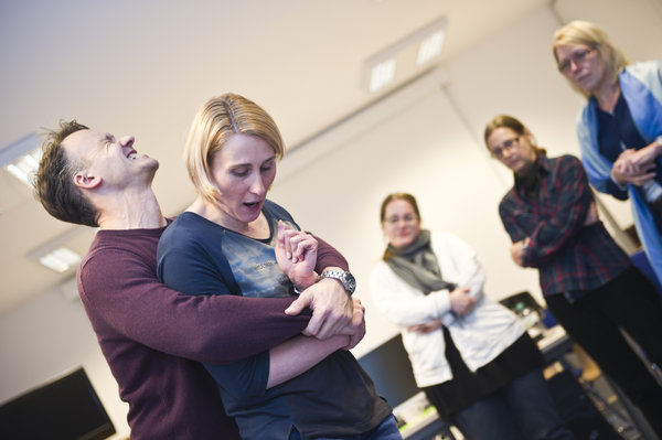 Als die Frau ihm den Rücken zuwendet, umschlingt der Angreifer sie von hinten. Sie reagiert sofort, hebt ihr Bein und tritt kräftig auf den Fuß des Mannes. Mit scheinbar schmerzverzerrtem Gesicht lässt er schließlich von ihr ab. "Man muss den Überraschungseffekt ausnutzen", sagt die Kursleiterin zu den elf Frauen und dem einen Mann, die an diesem Abend zu einem Kurs in Zivilcourage und Selbstsicherheit in die Münchner Polizeiinspektion Neuhausen-Nymphenburg gekommen sind. Rund zehn Mal im Jahr bieten die Polizeihauptmeisterin und ihr Kollege den Selbstbehauptungskurs an. Als Kontaktbeamte, die eigentlich zu Fuß auf den Straßen Münchens unterwegs sind, zählt dies zu ihren offiziellen Aufgaben.