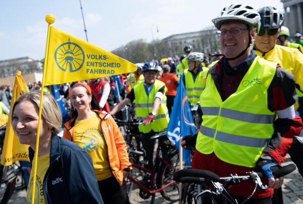Zahlreiche Teilnehmer nehmen an der Radsternfahrt durch die Münchner Innenstadt teil. Mit der ADFC-Radsternfahrt sollte 2019 den Forderungen des „Radentscheid München“ Nachdruck verliehen werden. (Foto: dpa/Sven Hoppe)