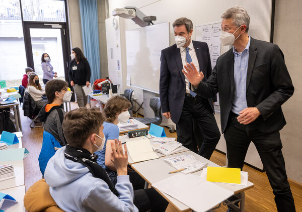 Markus Söder und Michael Piazolo beim Besuch einer Willkommensklasse des Gymnasium Trudering. (Foto: dpa/Peter Kneffel)