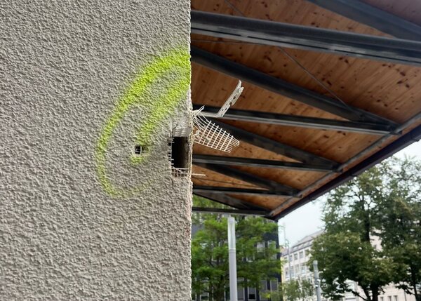 Ein Einschussloch am Gebäude des Israelischen Generalkonsulats. Nach dem mutmaßlichen Terroranschlag in der Münchner Innenstadt haben Ermittler laut einem Sprecher des bayerischen Landeskriminalamts etwa 100 Zeugen zur Tat befragt. (Foto: dpa)