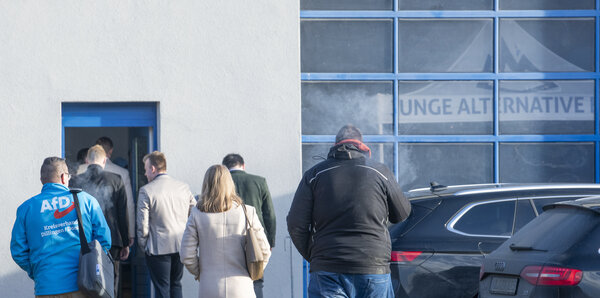 Menschen gehen in eine Gewerbehalle. Dort ist die Gründung des bayerischen Landesverbandes der AfD-Jugendorganisation Generation Deutschland geplant. (Foto: dpa/Stefan Puchner)