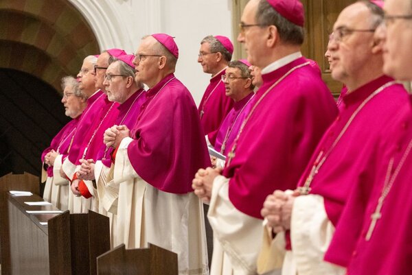 Mitglieder der Deutschen Bischofskonferenz beten während des Eröffnungsgottesdienstes. Wer wird Nachfolger von Georg Bätzing als neuem Vorsitzenden der Bischöfe? (Foto: dpa/HMB Media, Julien Becker)
