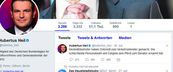 Heil hatte am Sonntag auf dem Kurznachrichtendienst Twitter Verkehrsminister Dobrindt mit einem Pferd verglichen. Heil twitterte: "Merkel&Seehofer haben Dobrindt zum Verkehrsminister gemacht. Die schlechteste Personalwahl seit Caligula sein Pferd zum Senator ernannt hat." Der römische Kaiser Caligula wollte einst seinem Lieblingspferd einen Sitz im Senat geben. Die Geschichte gilt heute als ein Sinnbild für Maßlosigkeit und Dekadenz.