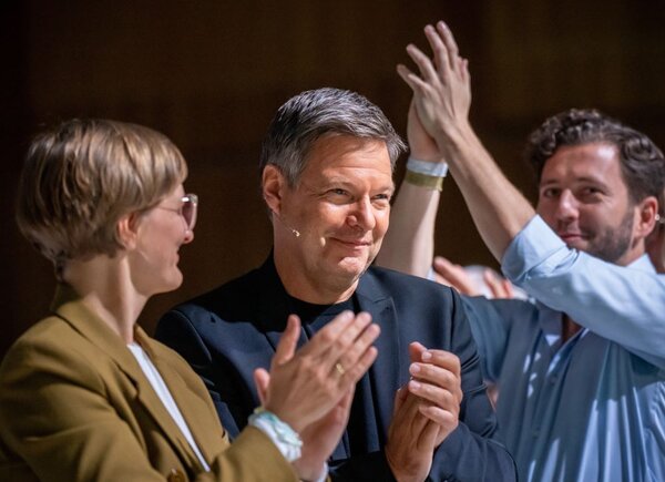 Zuvor hatten die Grünen bei ihrem Bundesparteitag in Wiesbaden Franziska Brantner und Felix Banaszak zu ihren neuen Vorsitzenden gewählt und Robert Habeck als "Kandidat für die Menschen in Deutschland, der das Zeug zu einem guten Bundeskanzler" habe, gekürt, also zum Kanzlerkandidaten. (Sascha Meyer, dpa)