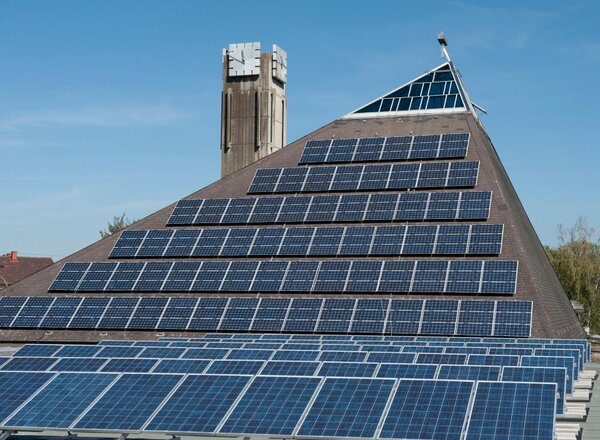 Auf dem Dach der St. Peter- und Paul-Kirche in Freiburg befindet sich eine PV-Anlage. Mehr als 60 kirchliche Institutionen weltweit haben jetzt bekanntgegeben, ihr Geld aus fossilen Energieträgern abzuziehen. (Foto: dpa/Caro/Kaiser)