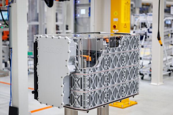 Der Querschnitt einer LkW-Batterie steht im Werk des Lkw- und Busherstellers MAN als Vorführmodell zum Start der Batterieproduktion für Elektromotoren. Nach über 100 Jahren Dieselmotorenbau startet MAN in Nürnberg die Batterieproduktion für Elektromotoren. (Foto: dpa/Daniel Karmann)