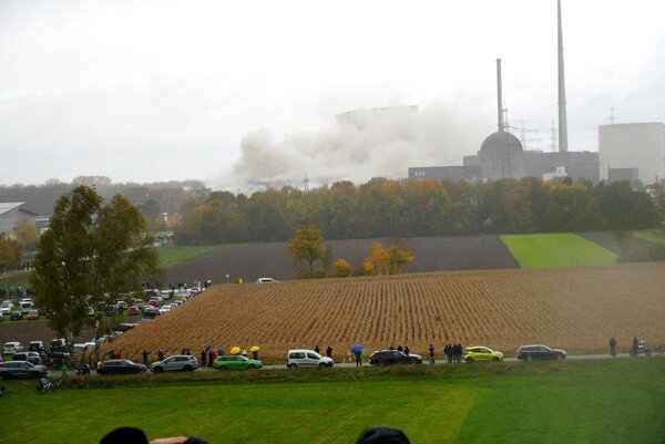 Nach Polizeiangaben beobachten rund 30.000 Schaulustige insbesondere aus Bayern und dem nahen Baden-Württemberg die spektakuläre Zerstörung eines Symbols des Atomzeitalters. Die Behörden hatten auf einer Länge von mehreren Kilometern Straßenabschnitte halbseitig gesperrt, um Parkplätze für die Zuschauerinnen und Zuschauer zu schaffen.