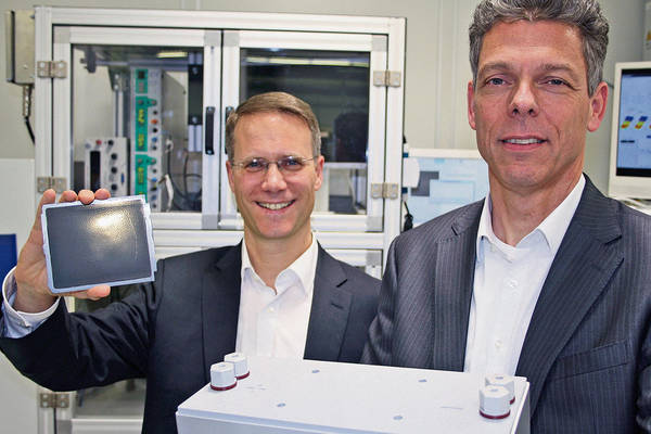 Eine Zelle des neuen Brennstoffzellen-Moduls hält Martin Schultz (links) in der Hand, der zusammen mit Stefan Schmitz (rechts) das Bamberger Bosch-Werk leitet. Tausend Zellen ergeben ein Modul mit zehn Kilowatt Leistung. (Foto: Töpfer)