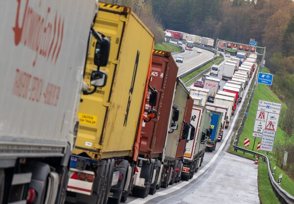 Wegen der Blockabfertigung der Lkws in Tirol staut es sich zurück bis Bayern. (Foto: dpa/Peter Kneffel)