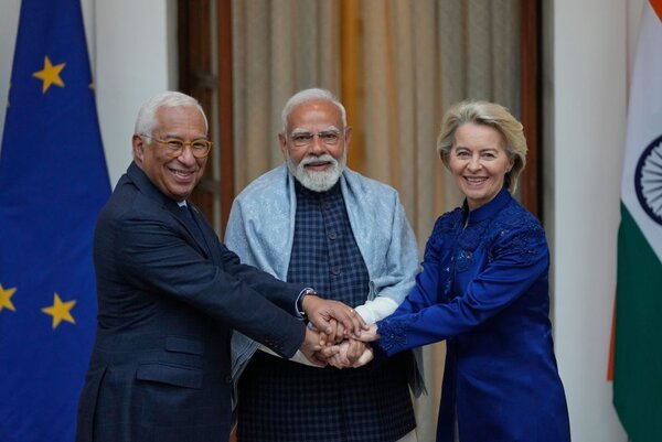 Haben das EU-Inden-Abkommen beschlossen (von links): EU-Ratspräsident Antonio Costa, Indiens Premierministerr Narendra Modi und EU-Kommissionispräsidentin Ursula von der Leyen. (Foto: picture alliance/ASSOCIATED PRESS, Manish Swarup)