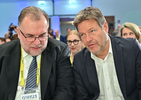 BDI-Präsident Siegfried Russwurm (links) spricht mit Bundeswirtschaftsminister Robert Habeck (Grüne) über die Kritik der Industrie am Kurs der Ampel-Regierung. (Foto: dpa/Patrick Pleul)